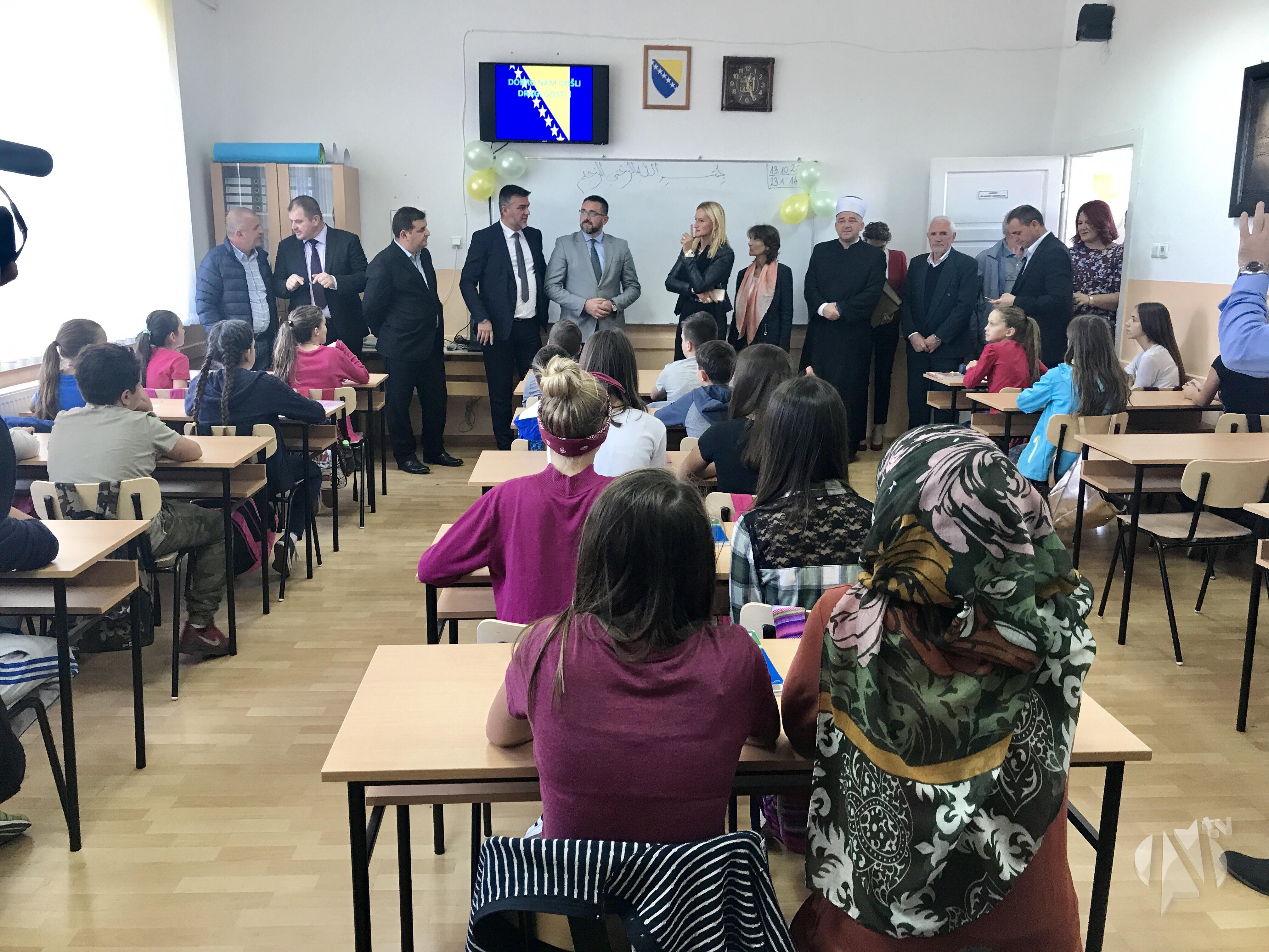 Ministar Ramić je najprije u pratnji izaslanstva Muftijstva tuzlanskog u Osnovnoj školi “Meša Selimović” otvorio školski kabinet za vjeronauku i rekonstruisano igralište te škole, gdje osnovnu školu pohađa 950 učenika.