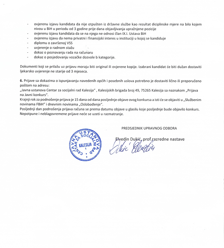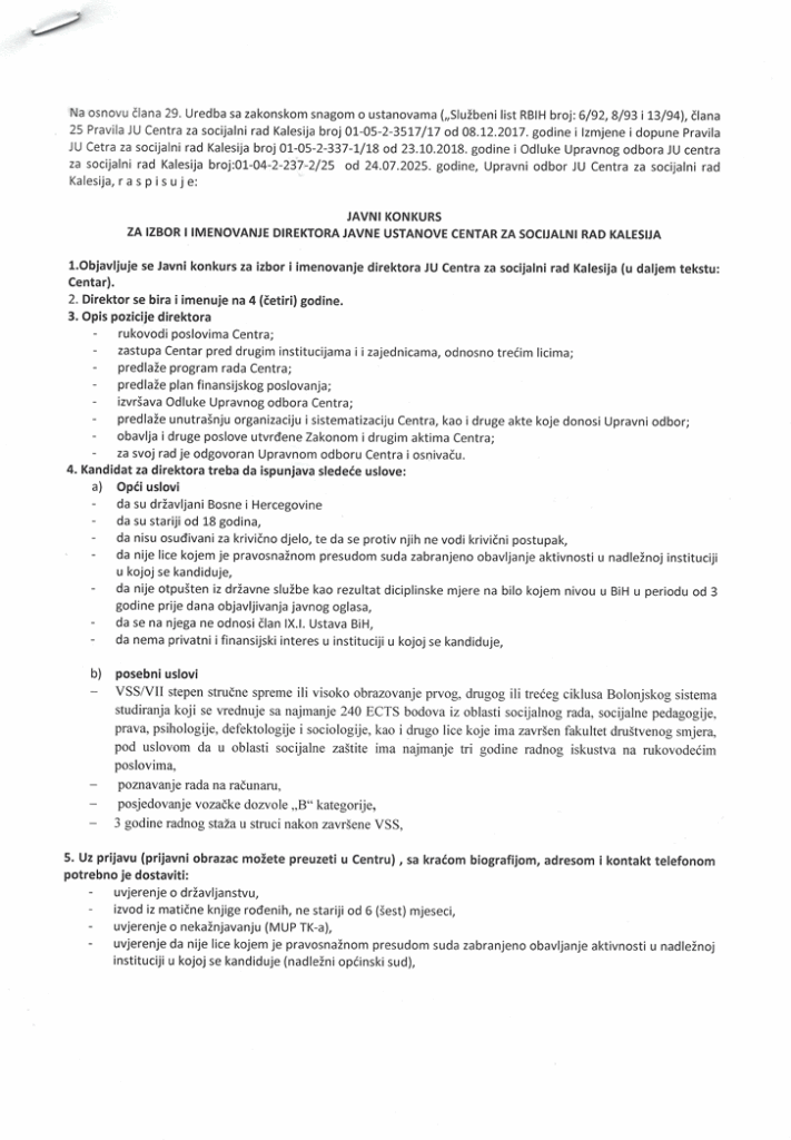 Upravni odbor Javne ustanove Centar za socijalni rad Kalesija raspisao je javni konkurs za izbor i imenovanje direktora oveustanove. Direktor se imenuje na period od četiri godine.