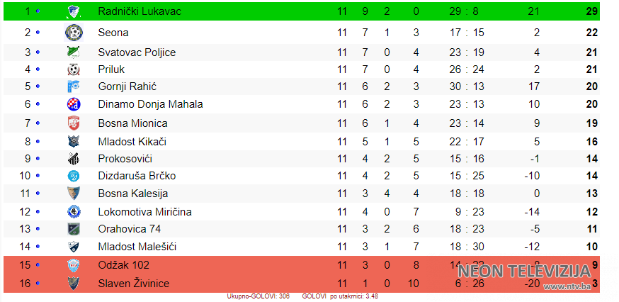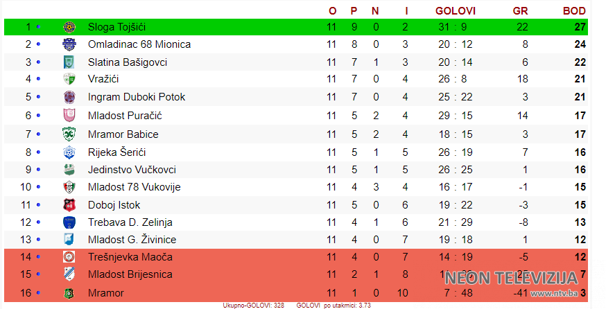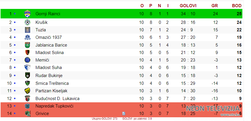 Prvo mjesto u Drugoj ligi TK grupa Jug zauzima ekipa “Rainci” iz Rainaca Gornjih sa 25 bodova. Bod manje na drugom mjestu ima ekipa Krušik, dok se Memići nalaze na 7 mjestu na tabeli sa 13 bodova.