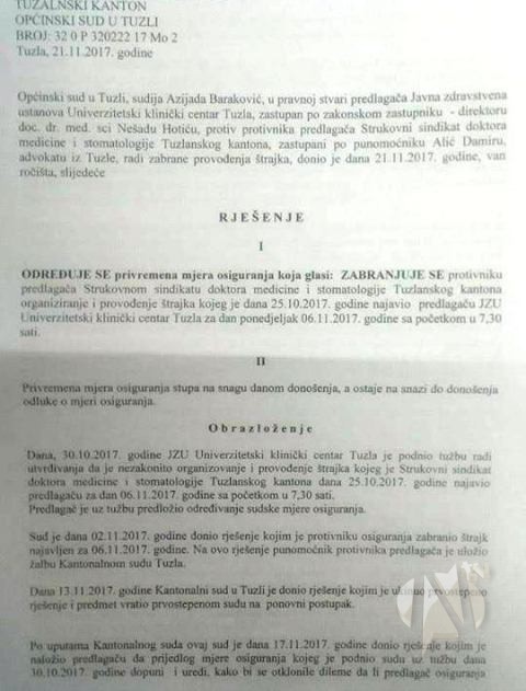 Nakon što je kantonalni sud u Tuzli prihvatio žalbu pravnog zastupnika Strukovnog sindikata doktora medicine i stomatologije Tuzlanskog kantona advokata Damira Alića, i ukinuo rješenje Općinskog suda u Tuzli o zabrani provođenja generalnog štrajka na Univerzitetsko-kliničkom centru Tuzla odnosno donio akt kojom se predmet vraća prvostepenom sudu na ponovni postupak, Općinski sud u Tuzli danas je van ročišta donio Rješenje o privremenoj mjeri osiguranja koja glasi: Zabranjuje se protivniku predlagača Strukovnog sindikata doktora medicine i stomatologije TK organiziranje i provođenje štrajka.