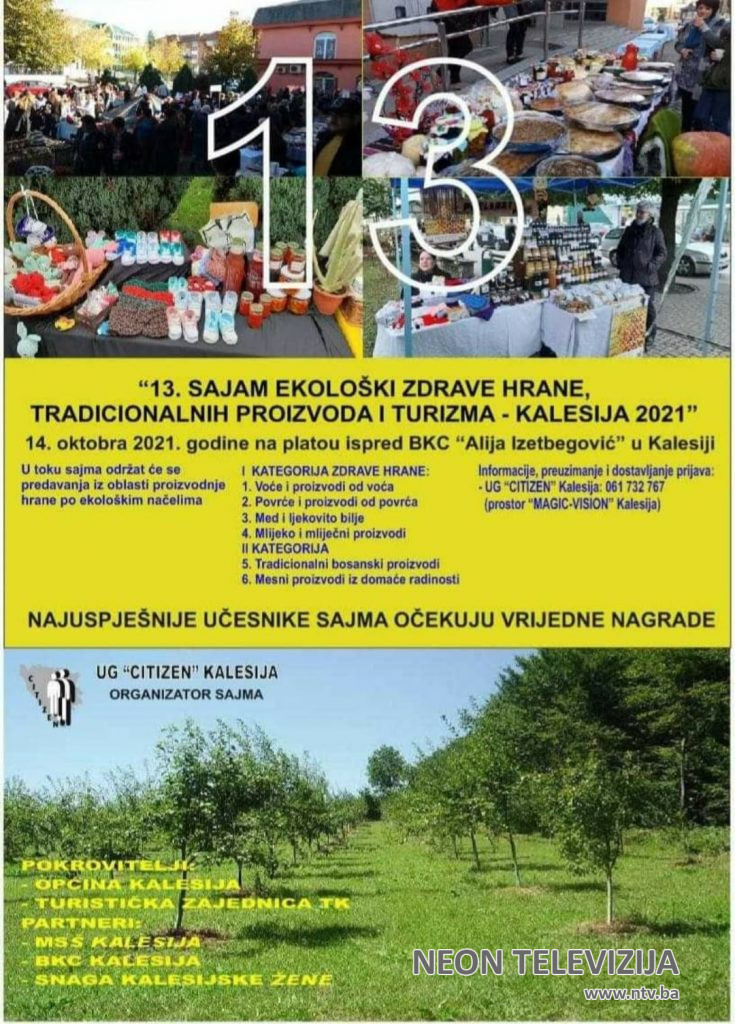 U organizaciji Udruženja građana “Citizen” 14.oktobra 2021.godine održat će se 13. sajam ekološki zdrave hrane, tradicionalnih proizvoda i turizma. Već tradicionalno sajam u Kalesiji održava se četvrtkom jer je to i pazarni dan.