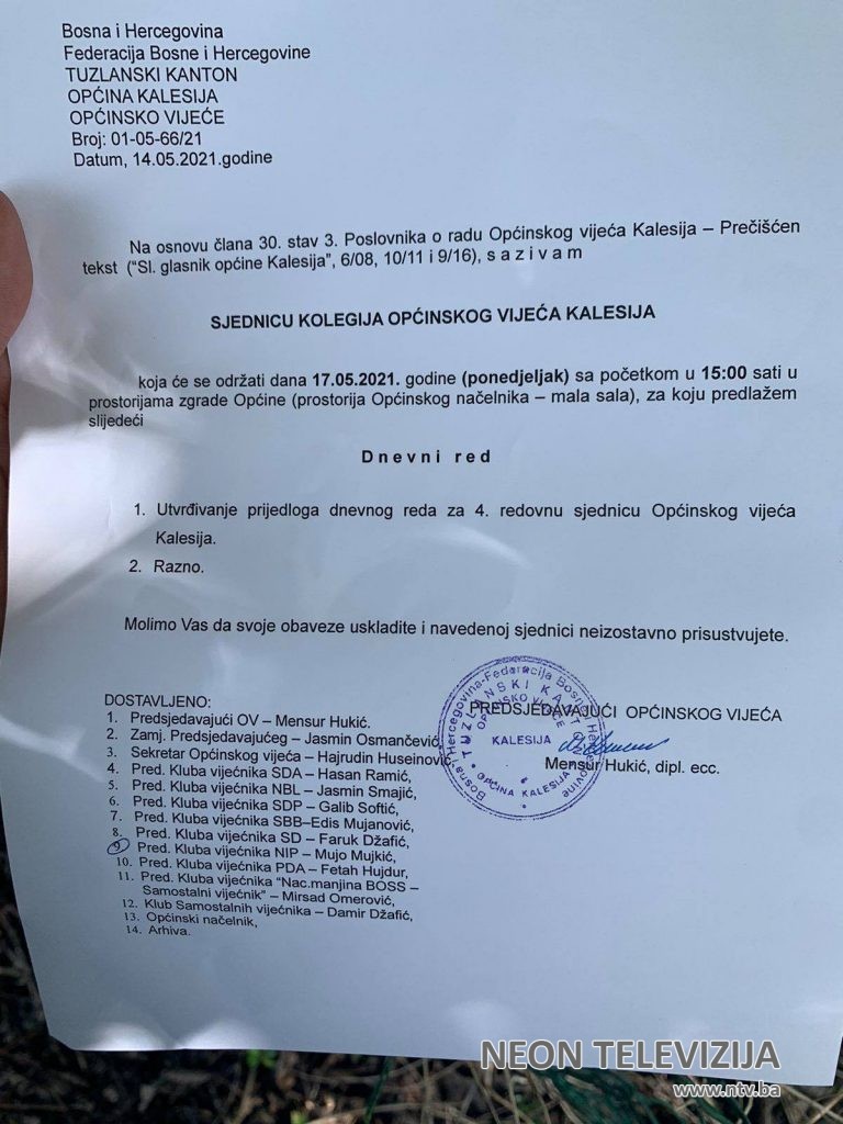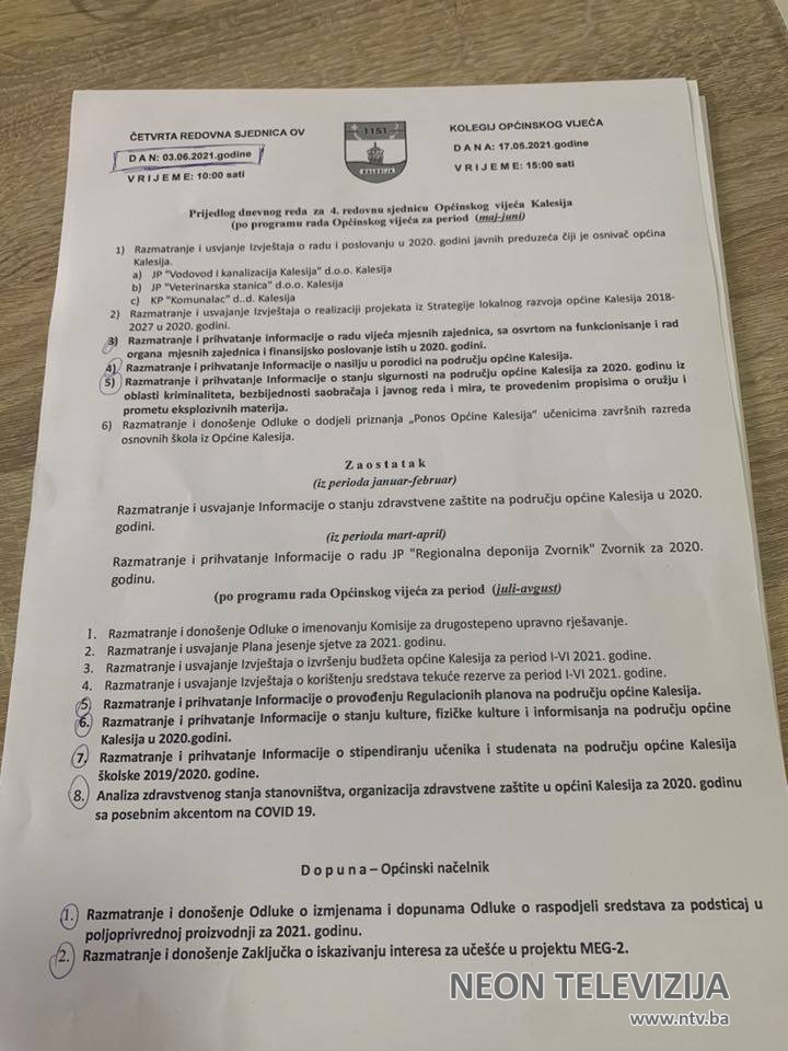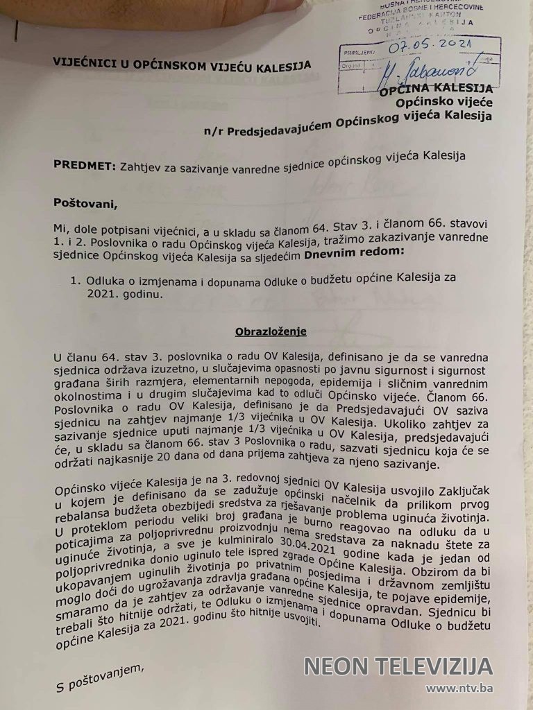 reda od strane načelnika, odnosno da li se radi o dopuni koja bi „neutralisala“ potrebu za održavanjem vanredne sjednice OV. Podsjećamo, 07.05.2021. je upućen i protokolisan Zahtjev za sazivanje vanredne sjednice OV, od strane 9 vijećnika, sa jednom tačkom dnevnog reda – Odluka o izmjenama i dopunama Odluke o budžetu općine Kalesija za 2021.god