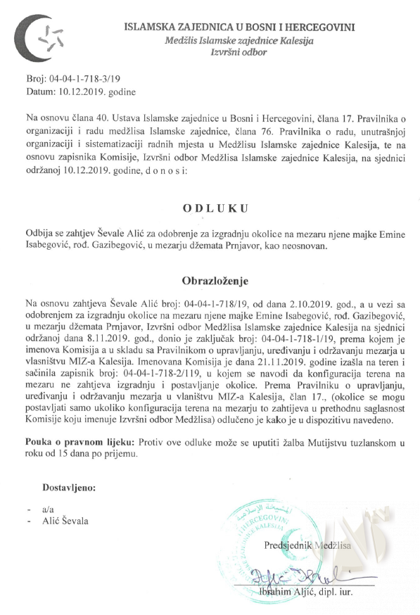 Naime, Alić Ševala, iz Tuzle, obratila se džematskom odboru Prnjavor zahtjevom za gradnju okolice i postavljanje novih nišana (stari su već bili postavljeni) na mezaru njene majke u centralnom mezarju u Prnjavoru. Isti ju je uputio na Medžlis IZ Kalesija, obzirom da gradnja okolice prema Pravilniku o mezarjima nije dozvoljena, osim u posebnim okolnostima, o čemu konačnu odluku donosi Izvršni odbor Medžlisa. Po upućenom zahtjevu Alić Ševala je upoznata sa sadržinom Pravilnika, pri čemu je preuzela jedan primjerak istog, a nakon nekoliko dana, dostavila je zahtjev za gradnju okolice, onako kako to Pravilnik predviđa. Izvršni odbor je zaprimio zahtjev, imenovao komisiju koja je izvršila uvid na licu mjesta i sačinila zapisnik sa preporukom, nakon čega je donesena odluka kojom se zahtjev Alić Ševale odbija kao neosnovan, jer nisu ispunjeni uslovi iz člana 17. Pravilnika: „Okolice se mogu postavljati samo ukoliko konfiguracija terena na mezarju to zahtijeva uz prethodnu saglasnost Komisije koju imenuje Izvršni odbora Medžlisa“, konfiguracija tla – ravničarski predio ne zahtjeva gradnju okolice radi postavljanja nišana.