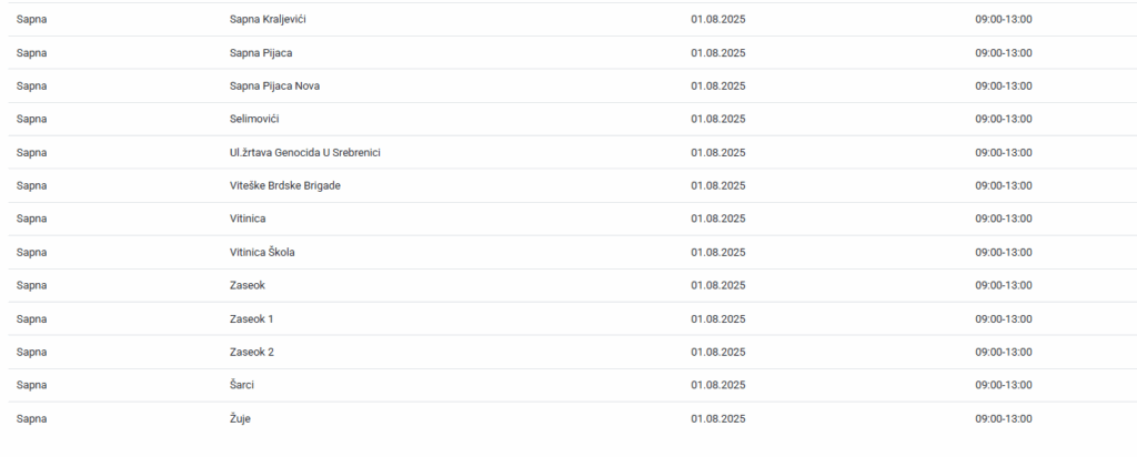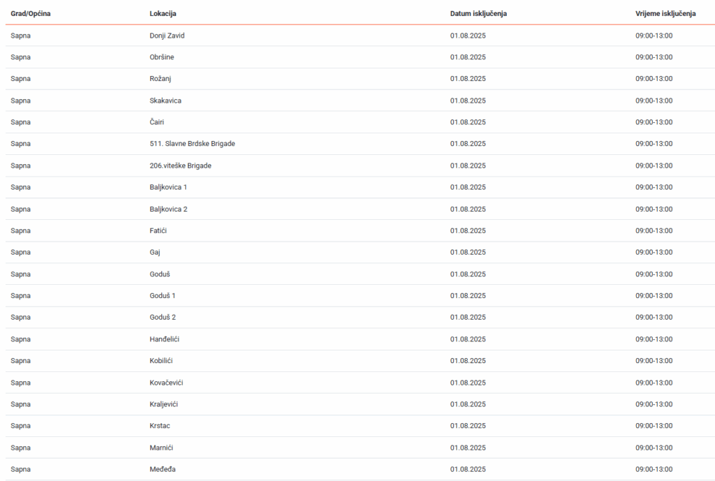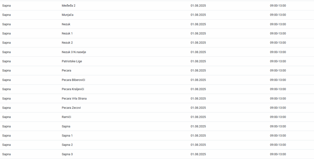 Naselja na području Sapne sutra će biti bez električne energije u periodu od 9 do 13 sati.