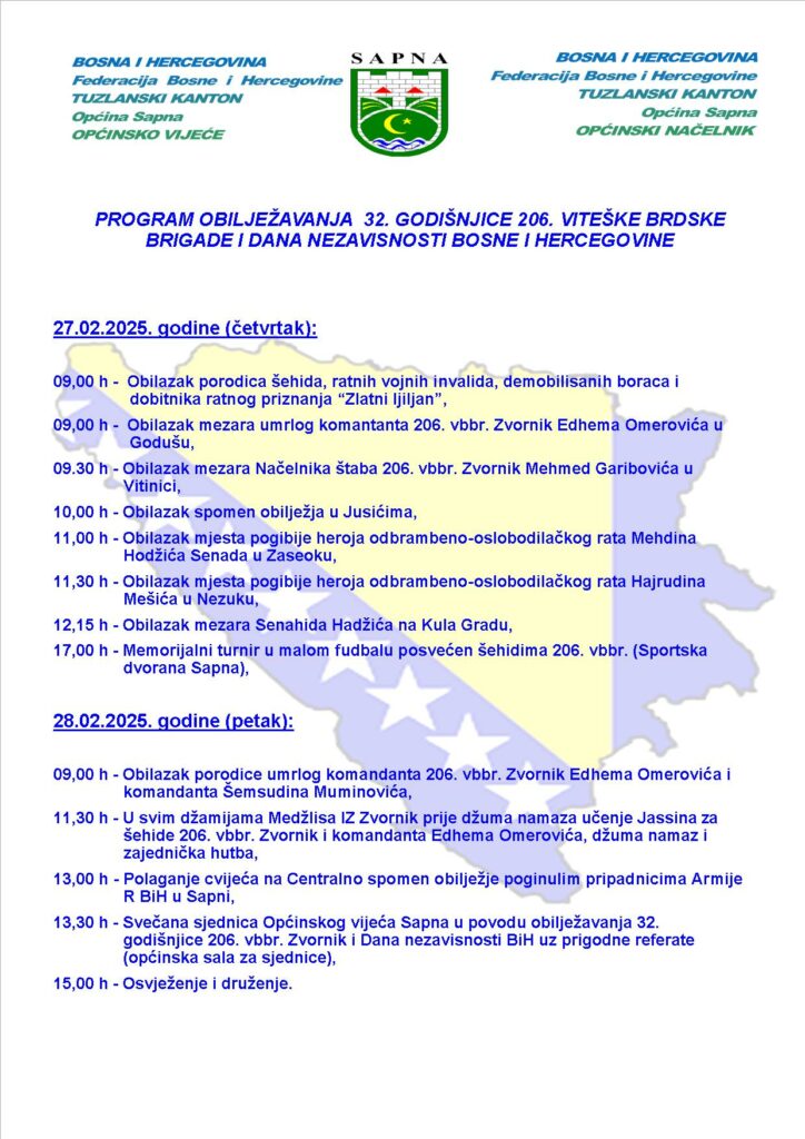 U četvrtak (27. februar) i petak (28. februar) u Sapni će biti obilježena 32. godišnjica formiranja 206. viteške brdske brigade i Dan nezavisnosti Bosne i Hercegovine.