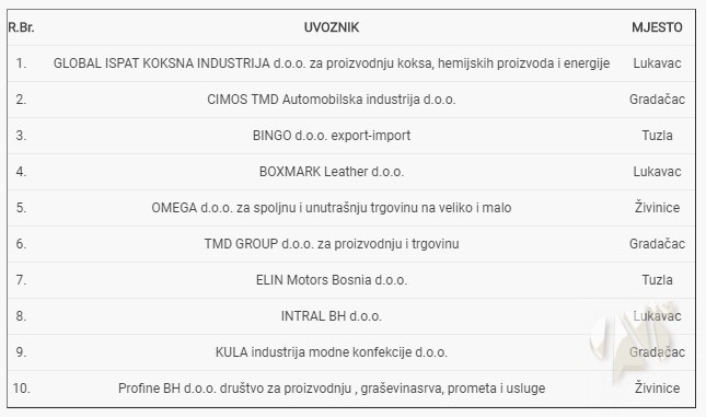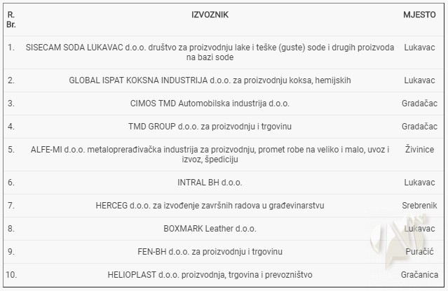 Na listi top deset izvoznika prva je Sisecam Soda Lukavac, potom slijede Global Ispat Koksna Industrija, Cimos TMD, TMD Group, Alfe – Mi, Intral BH, Herceg, Boxmark Leather, FEN – BH i Helioplast.