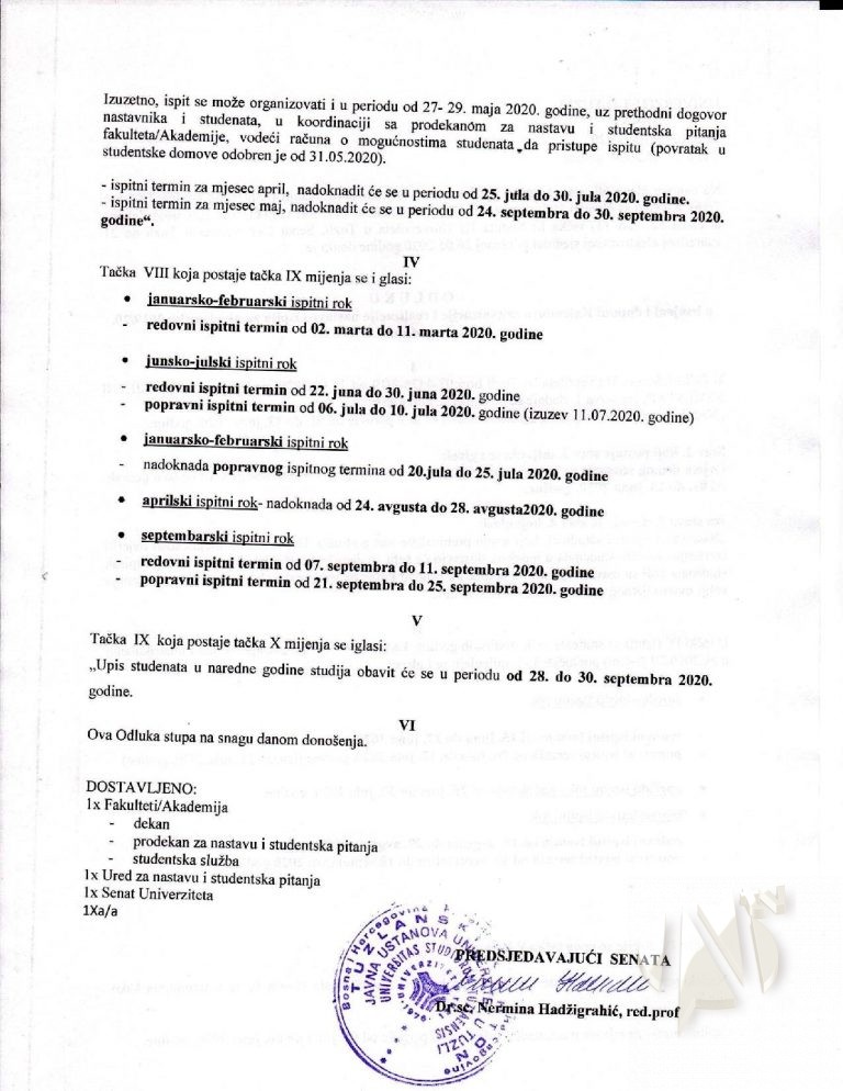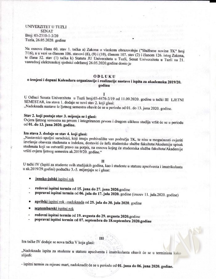 Na sjednici Senata UNTZ održanoj danas, 26.05.2020. godine, donesena je Odluka o izmjeni i dopuni Odluke o kalendaru organizacije i realizacije nastave i ispita za akademsku 2019/20 godinu na Univerzitetu u Tuzli. Istu prenosimo u cijelosti, s ciljem blagovremenog obavještavanja studenata: