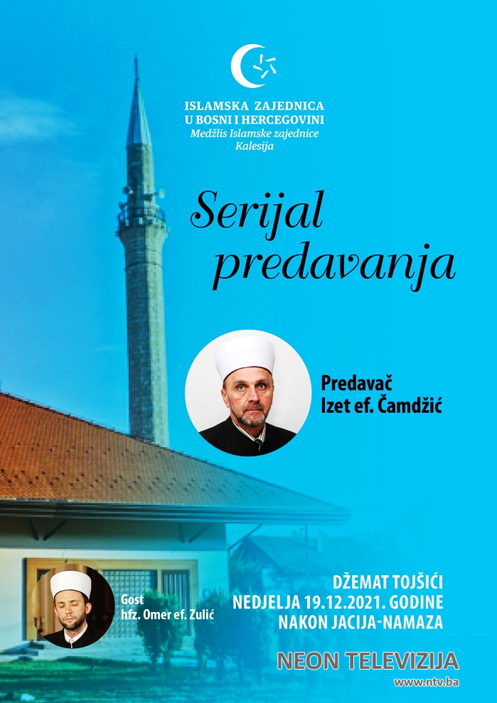 Serijal predavanja, koji je pokrenuo Medžlis Islamske zajednice Kalesija tokom pandemije, nastavlja se i u mjesecu decembru. U nedjelju, 19. decembra 2021. godine, nakon jacije-namaza, u džematu Tojšići biće upriličen vjerski program.