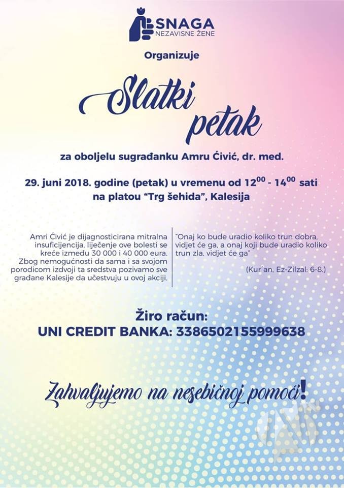 Akcija će se održati 29. juna u periodu od 12-14 sati na Trgu šehida u Kalesiji. Amri Ćivić  je prošle godine dijagnosticirana Mitralna insuficijencija. Operacija, koju je mora izvršiti van Bosne i Hercegovine košta  30.000 i 40.000 eura.