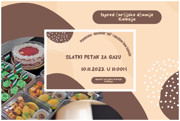 Humanitarna akcija pod nazivom “Slatki petak za Gazu” bit će upriličena u petak 10.11.2023.godine sa početkom u 11 sati ispred Čaršijske džamije u Kalesiji.