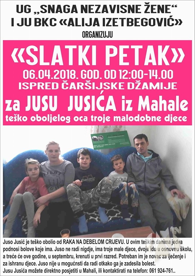 Kako bi pomogli porodici Jusić i na taj način umanjili njihove probleme UG “Snaga nezavisne žene” i JU BKC “Alija Izetbegović” Kalesija organizuju akciju “Slatki petak”. Akcija “Slatki petak” bit će održana u 6.4.2018 godine pd 12:00 do 14:00 sati ispred Čaršijske džamije.