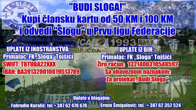 Moderno uređene klupske prostorije, vrhunski klupski restoran, preko stotinu članova omladinskih kategorija koje se takmiče u kvalitetnoj ligi BiH, te trenutno 2.pozicija na tabeli 2. Lige FBIH Sjever, potvrda su da klub kao što je Sloga zaslužuje mjesto u Prvoj ligi FBiH”, stoji u objašnjenju Sloge kao najava za borbu za ulazak u Prvu ligu FBiH.