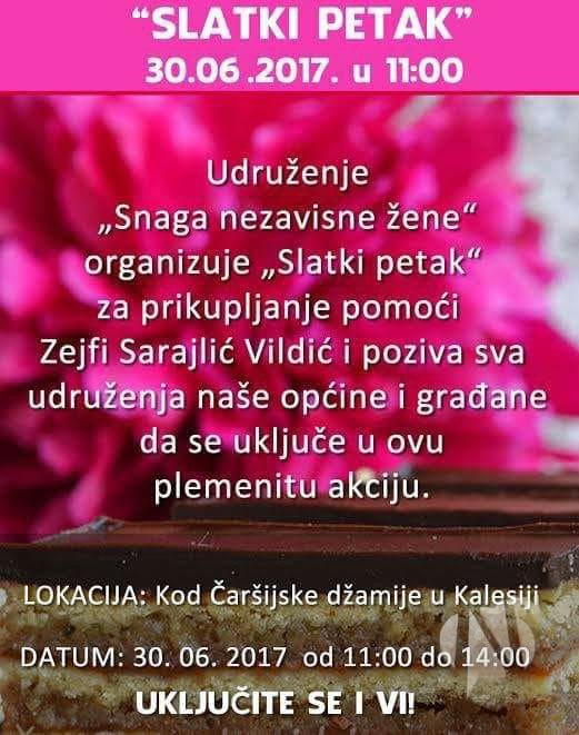 U organizaciji Udruženja “Snaga nezavisne žene” 30.06.2017. godine u periodu od 11 do 14 sati održat će se “Slatki petak” kako bi se sakupila novčana pomoć za našu sugrađanku Zejfu Vildić koja boluje od leukemije.