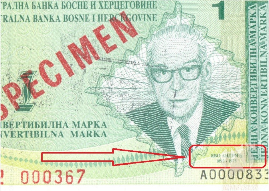 Novčanica potiče iz 1998. godine. Izdanje je predviđeno za Republiku Srpsku, a Ivo Andrić je napisano na ćiriličnom pismu. No, ako obratite pažnju, vidjet ćete da je napravljena slovna greška, te da umjesto Ivo Andrić na ćirilici piše Ivo Andriđ.