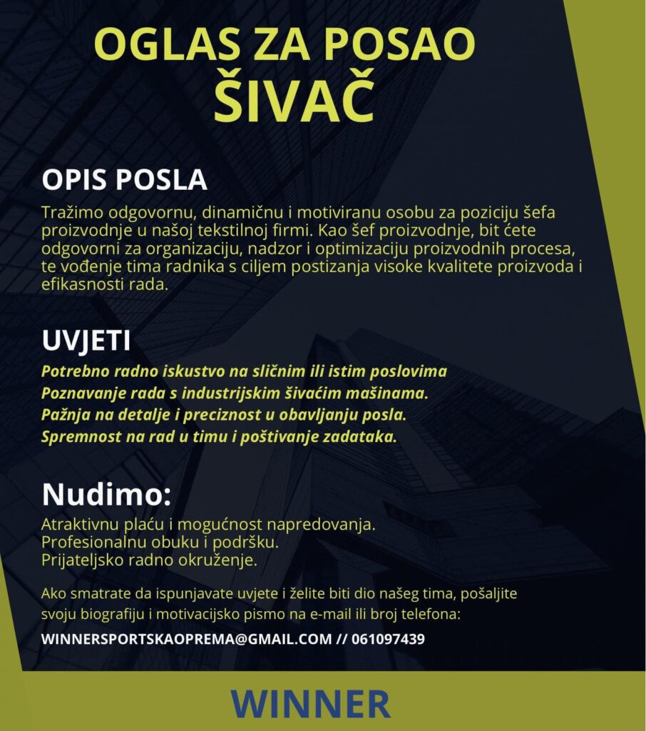 Sportska oprema Winner Živinice traži radinka/šivač.