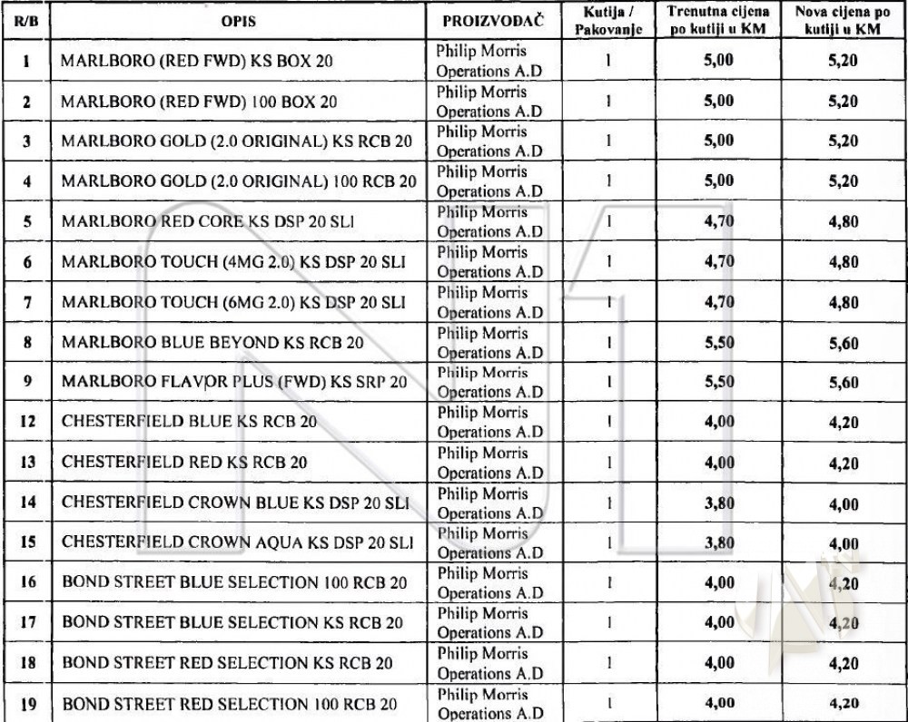 Tako će prvi poskupjeti proizvodi kompanije Philip Morris, odnosno njihove cigarete s logom Marlboro, Chesterfield i Bond. Sljedeći na „udaru“ će biti konzumenti proizvoda Tvornice duhana Rovinj (TDR), tačnije one osobe koje konzumiraju Dunhill.