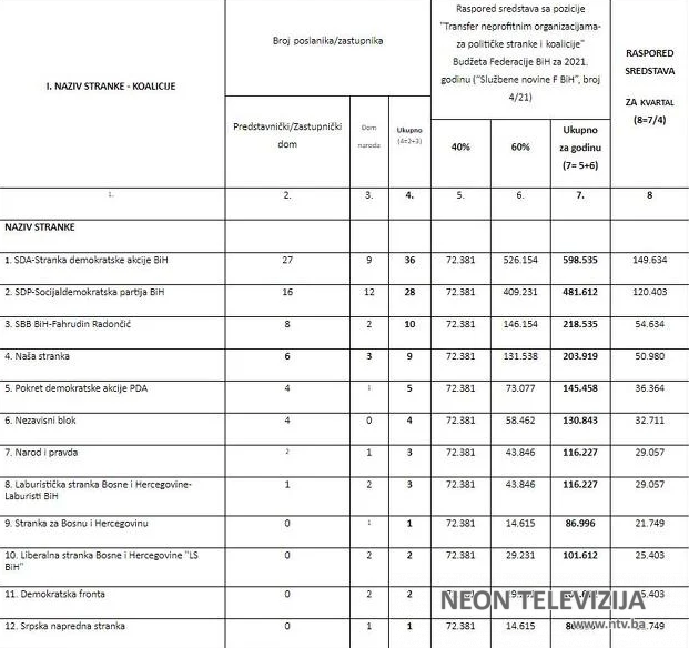 Radi se o Odluci o usvajanju programa utroška sredstava s kriterijima raspodjele sredstava “tekući transferi neprofitnim organizacijama – za političke stranke i koalicije” utvrđenih budžetom FBiH za 2021. godinu Vlade FBiH, koja je objavljena i u Službenim novinama FBiH, piše Klix.ba.