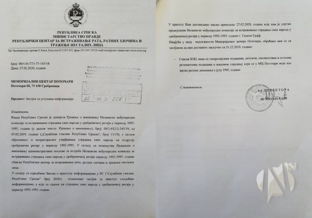 – U skladu sa odredbama Zakona o pristupu informacijama RS podnosimo zahtjev za pristup sljedećim informacijama, a koje se odnose na stradanje svih naroda u srebreničkoj regiji u periodu 1992-1995. Zaključno sa 31. decembrom 2019. godine, spisak 8.372 lica sa generalijskim podacima o njihovom stradanju koji se u Memorijalnom centru Potočari vode kao žrtve ratnih dešavanja u julu 1995. – navedeno je, između ostalog, u dopisu koji potpisuje v.d. direktora Republičkog centra za istraživanje rata, ratnih zločina i traženje nestalih lica Milorad Kojić. U prilogu svog dopisa, Kojić je dostavio i pismo Gideona Greifa, predsjednika tzv. Nezavisne komisije, koji traži ove podatke, a centar na čelu sa Kojićem ga servisira.