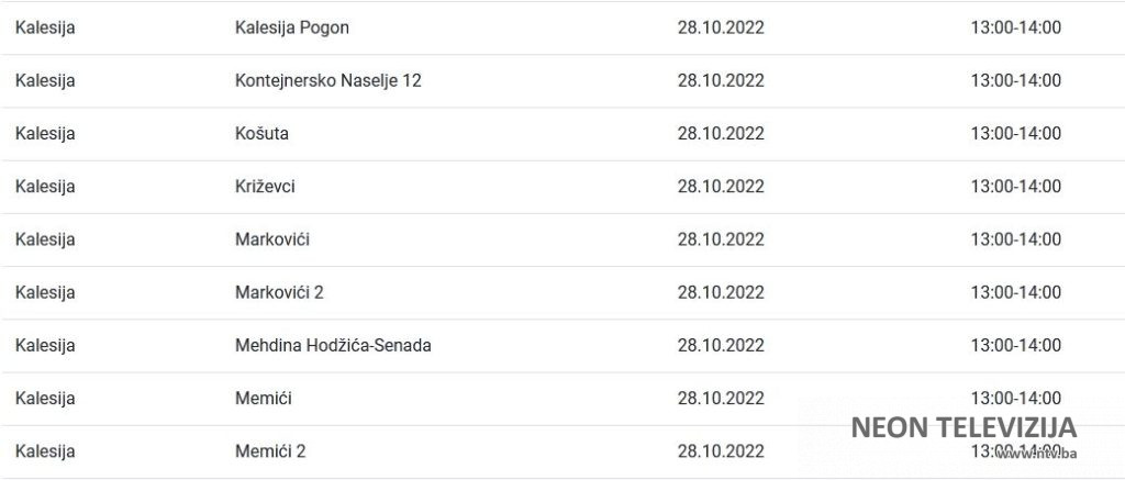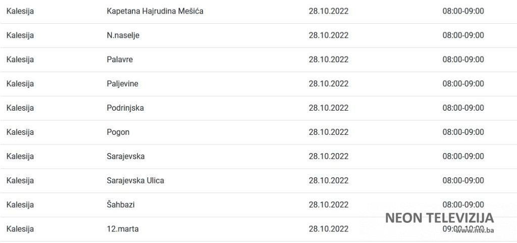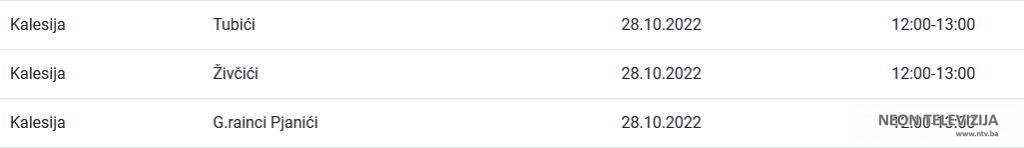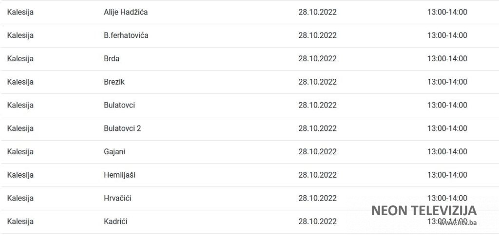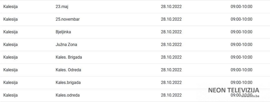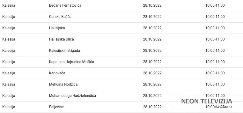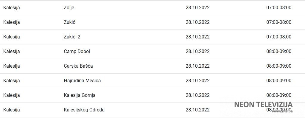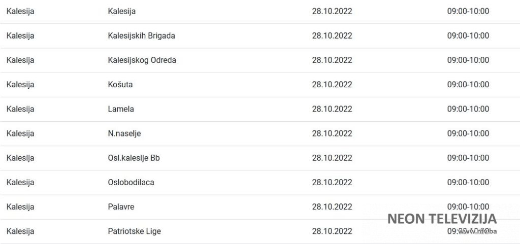Elektroprivreda Bosne i Hercegovine je za područje distribucije Tuzla za petak 28. oktobra najavila planska isključenja električne energije za više naselja i ulica u Kalesiji. Prekidi ili ograničenja isporuke električne energije najavljeni su zbog planiranih isključenja, odnosno ograničenja radi održavanja, remonta, priključenja novih kupaca, kao i drugih investicijskih radova, poručeno je iz ove institucije.