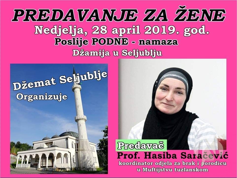 U okviru predrazamaskih aktivnosti džemat Seljublje organizuje predavanje za žene, koje će se održati u nedjelju, 28. aprila 2019. godine, poslije podne-namaza.