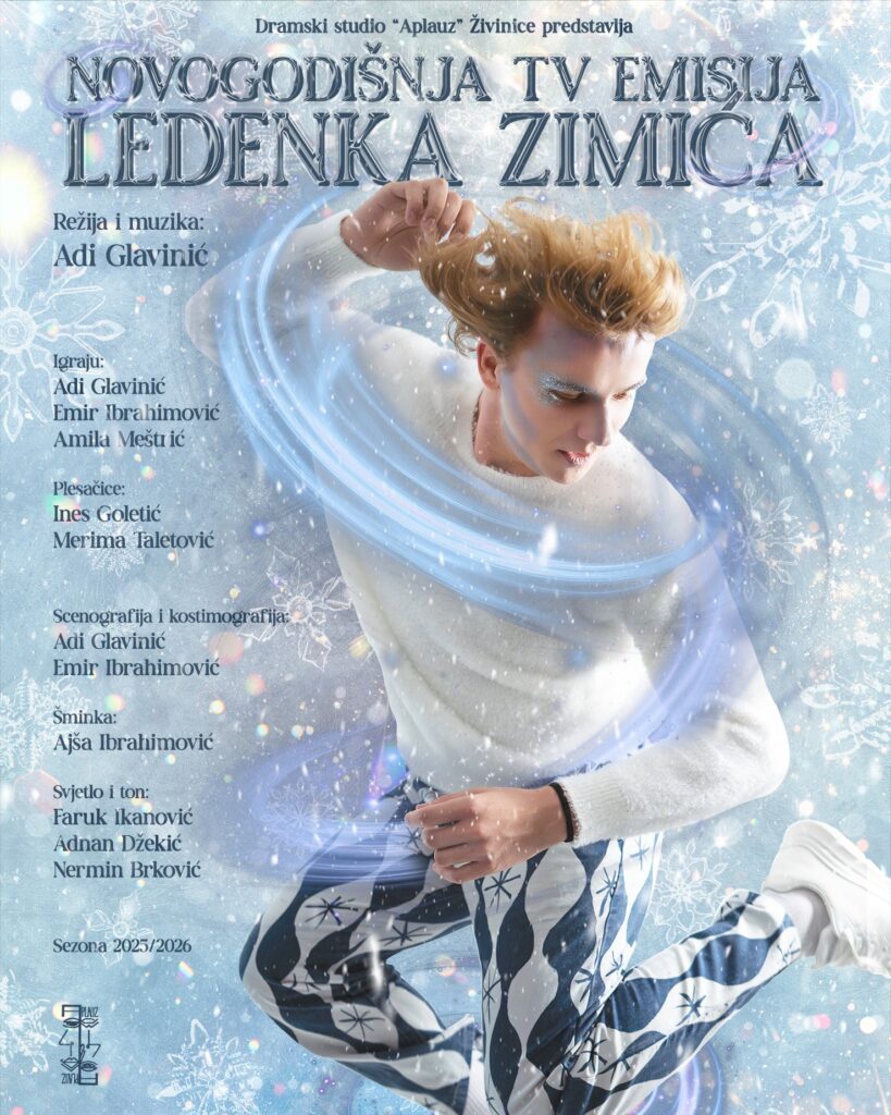 “Ledenko Zimić, omiljeni voditelj sa Sjevernog pola, ponovo vodi specijalno novogodišnje izdanje svoje TV emisije – uživo pred publikom! Iz studija punog pahulja, lampica i smijeha, dočekuje neobične goste: Staru godinu, Začasa Brzića, Novu godinu i Djeda Mraza. Kroz pjesmu, igru, kviz, reklame i duhovite razgovore, Ledenko podsjeća da život nema reprizu – i da se najljepše stvari dešavaju kad se pleše, sanja i vjeruje u dobro. Ovo nije samo emisija – već veseli podsjetnik da svaka nova godina donosi priliku da počnemo iznova” opis je ovo predstave “Novogodišnja tv emisija Ledenka Zimića” koja se igra sutra na velikoj sceni BKC-a Živinice. Počinje u 18:30 sati. Ista je je nastala u sklopu produkcije Dramskog studija „Aplauz“ Živinice.