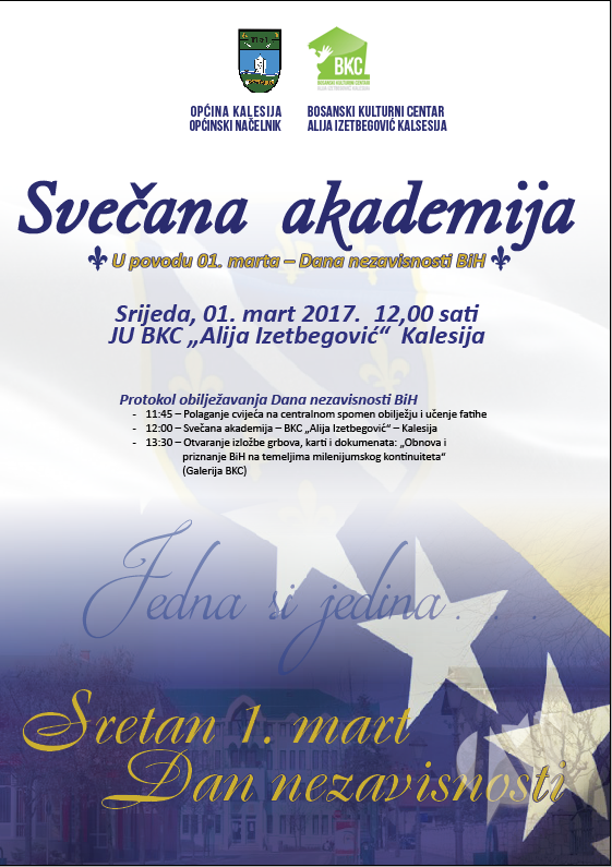 U povodu 1. marta- Dana nezavisnosti Bosne i Hercegovine sutra će u BKC-u “Alija Izetbegović” Kalesija biti održana svečana akademija.