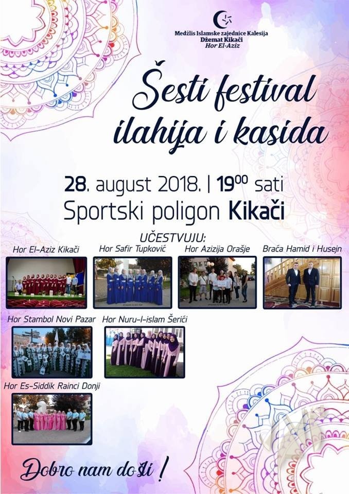 Medžlis Islamske zajednice Kalesija, džemat Kikači i hor El-Aziz organizuju VI Festival ilahija i kasida koji će se održati 28. augusta 2018. godine, sa početkom u 19:00 sati na poligonu u Kikačima.
