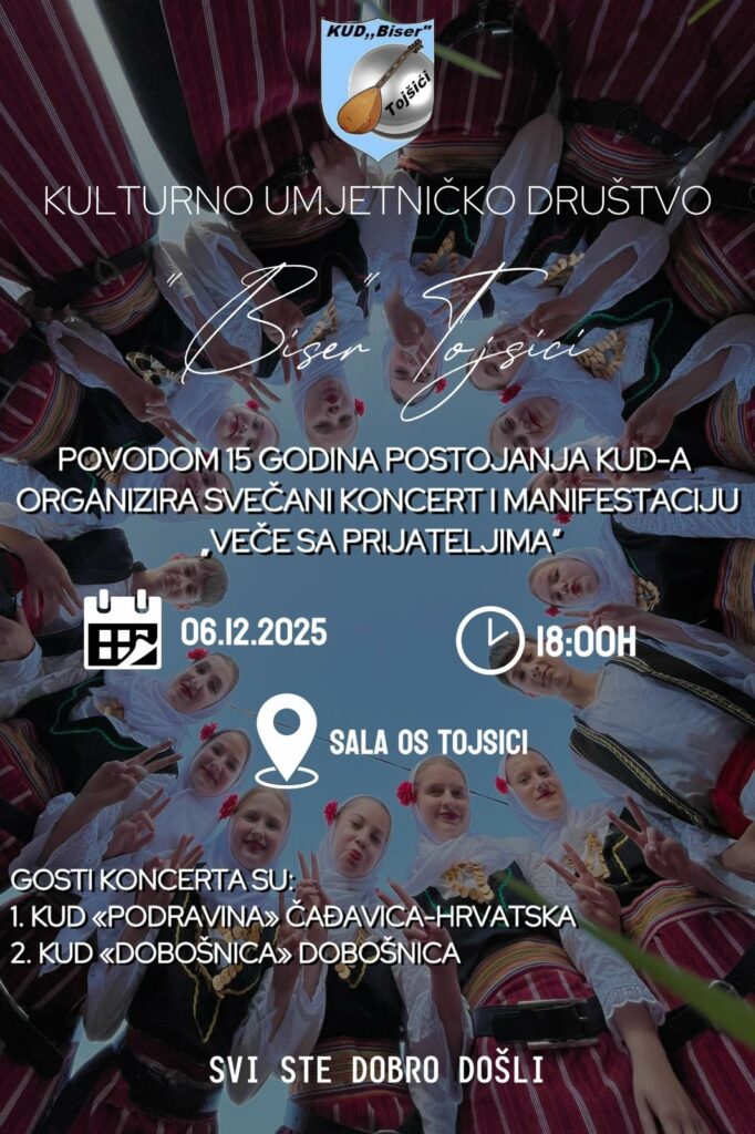 Kulturno umjetničko društvo “Biser” Tojšići ove godine slavi jubilej, 15 godina svog postojanja i rada. Tim povodom pomenuto kulturno umjetničko društvo organizuje svečani koncert i manifestaciju “Veče sa prijateljima”, koja će biti održana 6. decembra (subota) 2025. godine u sali Osnovne škole Tojšići, s početkom u 18:00 sati.