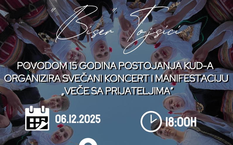 Kulturno umjetničko društvo “Biser” Tojšići ove godine slavi jubilej, 15 godina svog postojanja i rada. Tim povodom pomenuto kulturno umjetničko društvo organizuje svečani koncert i manifestaciju “Veče sa prijateljima”, koja će biti održana 6. decembra (subota) 2025. godine u sali Osnovne škole Tojšići, s početkom u 18:00 sati.