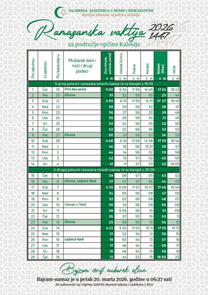 S akšamskim ezanom u srijedu nastupa mubarek mjesec ramazan. Iste večeri klanjat će se prvi teravih-namaz, dok je prvi dan posta u četvrtak.
