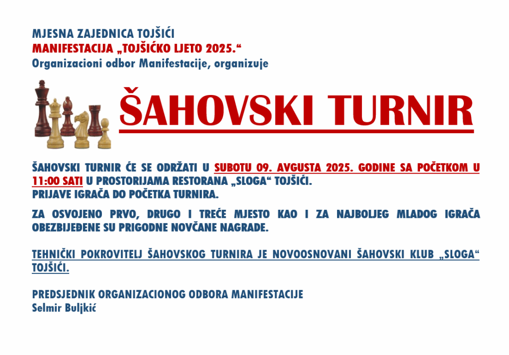 U okviru manifestacije “Tojšićko ljeto 2025”, Mjesna zajednica Tojšići i Organizacioni odbor manifestacije organizuju šahovski turnir, koji će se održati u subotu, 9. avgusta 2025. godine u prostorijama restorana “Sloga” u Tojšićima, s početkom u 11:00 sati.