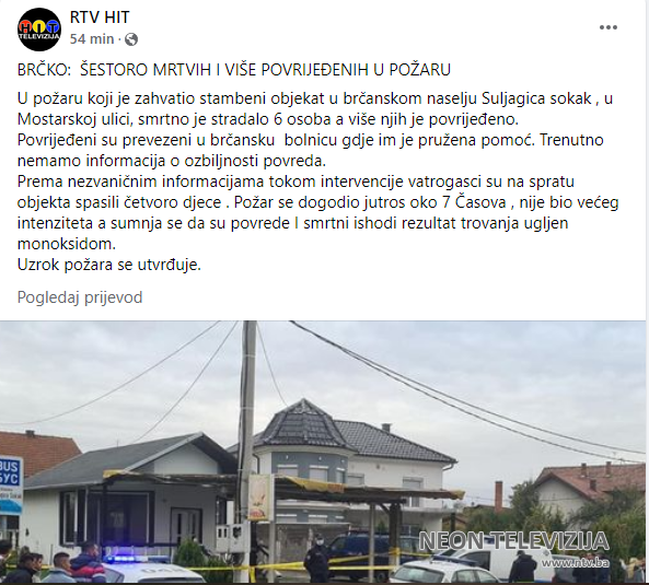 U požaru koji je zahvatio stambeni objekat u brčanskom naselju Suljagica sokak, u Mostarskoj ulici, smrtno je stradalo šest osoba a više njih je povrijeđeno, javlja brčanska televizija HIT.