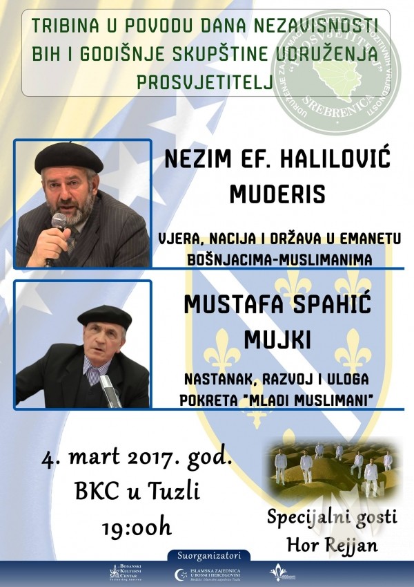 Udruženje Prosvjetitelj Muallim Srebrenica povodom Dana nezavisnosti BiH i 24. godišnjice Udruženja organizuje tribinu koja će se održati u subotu 4. marta u Velikoj sali BKC Tuzla sa početkom u 19:00.