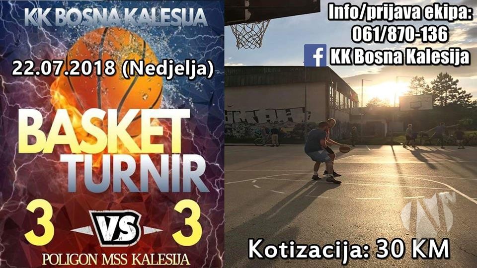 KK “Bosna” Kalesija u nedjelju, 22.7.2018. organizuje turnir u basketu. Također, turnir će biti humanitarnog karaktera, a sredstva koja se prikupe na turniru bit će namijenjena za liječenje doktorice Amre Ćivić iz Vukovija Gornjih. Prijave ekipa su završene, a prijavilo se 10 ekipa koje su podijeljene u dvije grupe (5 u jednoj, 5 u drugoj grupi).