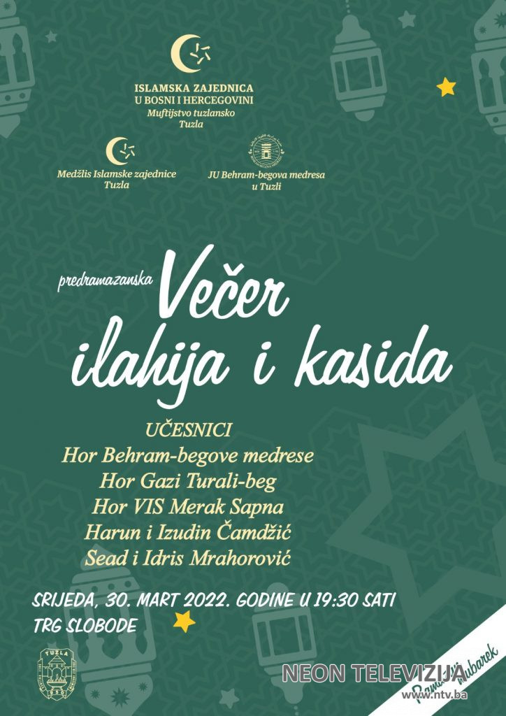 Medžlis Islamske zajednice Tuzla i Behram-begova medresa u Tuzli, pod pokroviteljstvom Muftijstva tuzlanskog, u srijedu 30. marta 2022. godine na Trgu slobode s početkom u 19:30 sati organizuju predramazansku Večer ilahija i kasida.