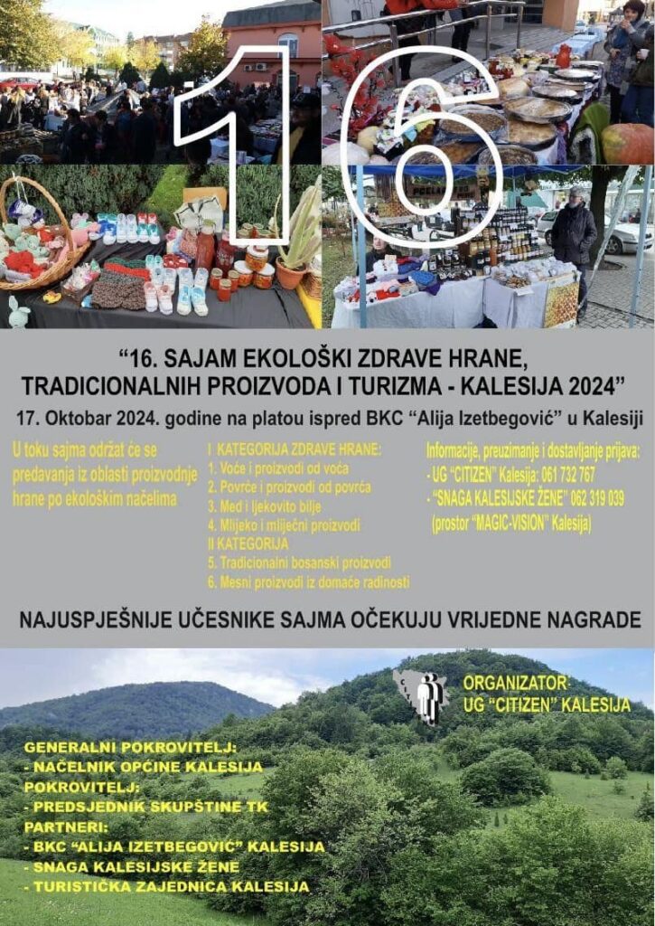 Sajam ekološki zdrave hrane, tradicionalnih proizvoda i turizma u Kalesiji bit će održan u četvrtak, 17. 10. 2024. godine, na trgu ispred BKC “Alija Izetbegović”.