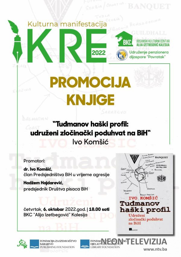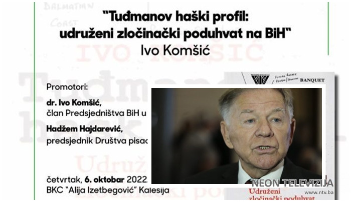 U četvrtak, 6. oktobra, sa početkom u 18,00 sati, u velikoj sali kalesijskog BKC-a, održat će se promocija knjige „Tuđmanov haški profil: udruženi zločinački poduhvat na BiH“ Ive Komšića. Osima autora prof. dr. Ive komšića, člana Predsjedništva BiH u vrijeme Agresije na BiH, o knjizi će govoriti i književnik Hadžem Hajdarević, predsjednik Društva pisaca BiH. Moderator je književnik i novinar Fahrudin Sinanović.