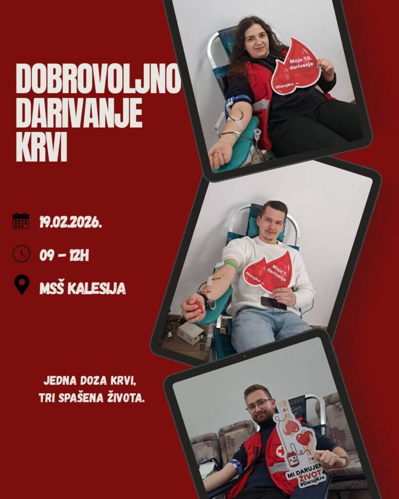 Crveni križ općine Kalesija u saradnji sa Poliklinikom za Transfuziologiju UKC-a Tuzla organizuje akciju dobrovoljnog darivanja krvi. Akcija će se održati u četvrtak, 19. februara, u periodu od 9 do 12 sati u prostorijama Mješovite srednje škole Kalesija.