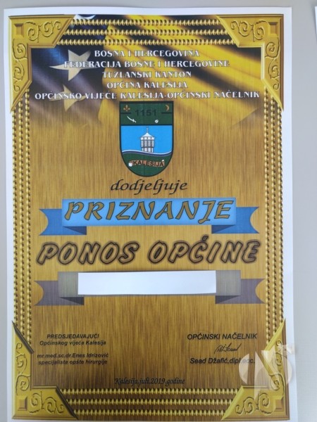 Priznanje „Ponos Općine Kalesija“ dodjeljuje se u vidu plakete i novčane nagrade u pojedinačnom iznosu od 100,00 konvertibilnih maraka jednokratno.