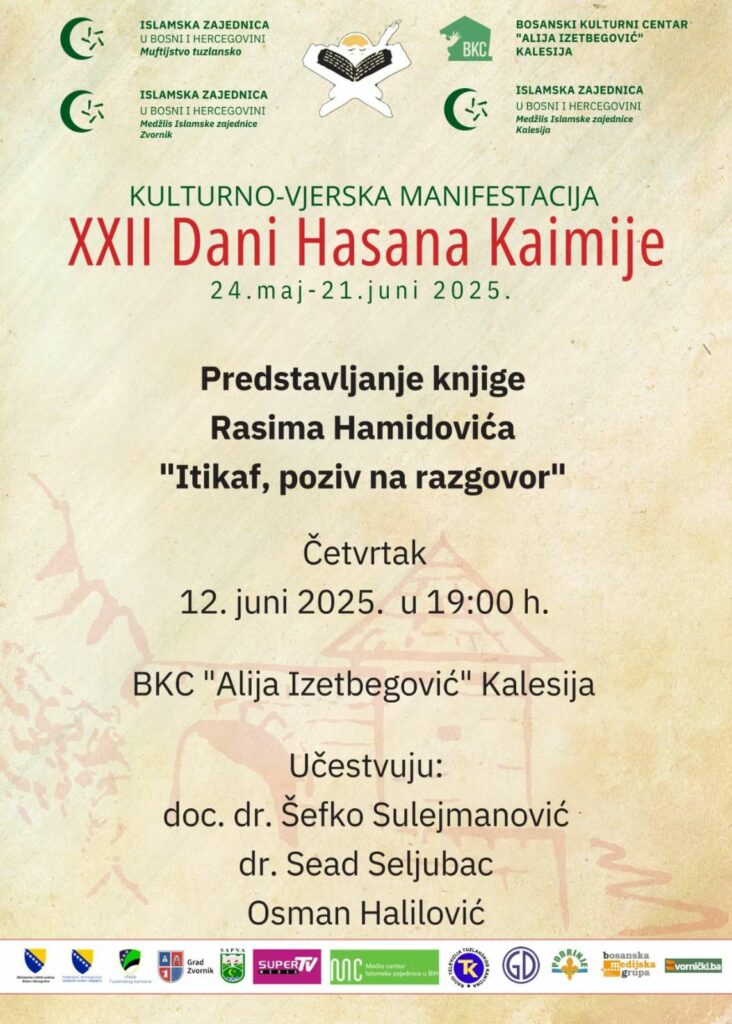 U okviru kulturno – vjerske manifestacije XXII Dani Hasana Kaimije, u četvrtak, 12.06.2025. godine, u Bosanskom kulturnom centru “Alija Izetbegović” u Kalesiji sa početkom u 19:00 sati bit će upriličena promocija kalesijskog imama Rasima Hamidovića “Itikaf, poziv na razgovor”.