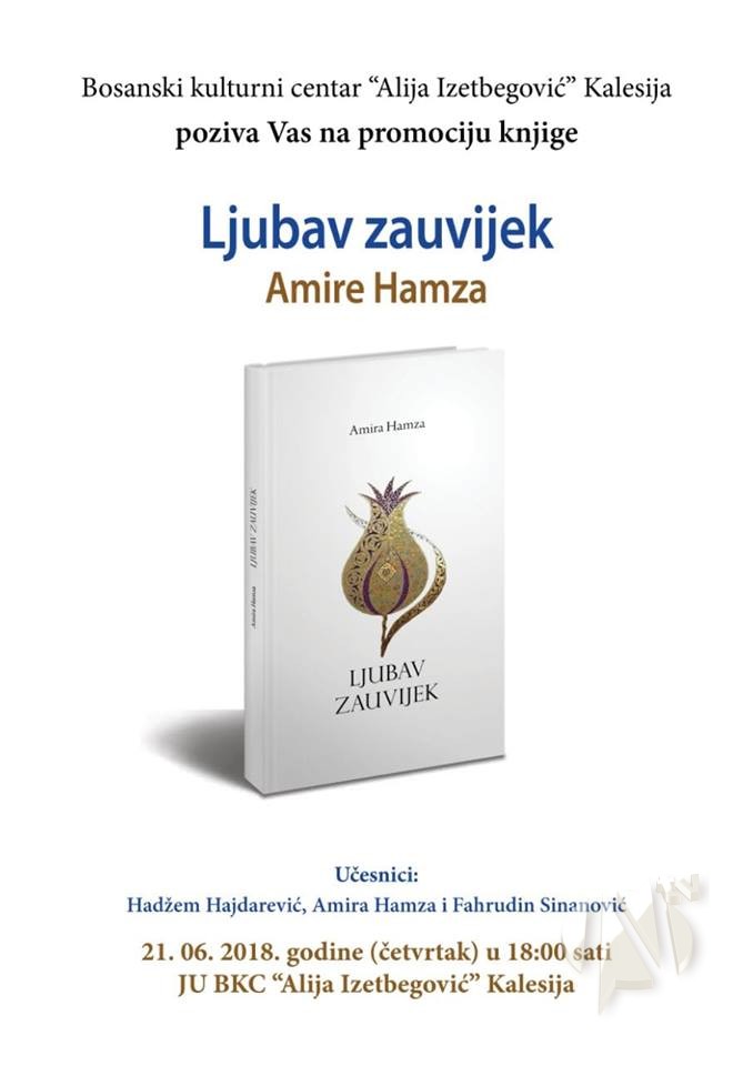 U četvrtak 21.6.2018.godine u BKC “Alija Izetbegović” bit će upriličena promocija knjige “Ljubav zauvijek” autorice Amire Hamze. Poromocija počinje u 18:00 sati a osim autorice o knjizi će govoriti Hadžem Hajdarević i Fahrudin Sinanović.