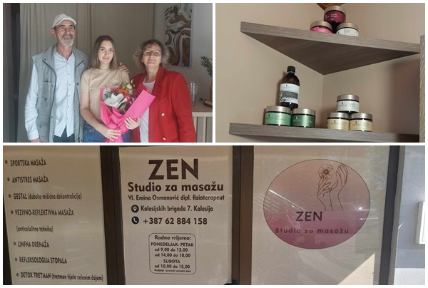Danas je u ulici Kalesijskih brigada 7. svečano otvoren studio za masažu “Zen”. Na ovaj korak odlučila se Emina Osmanović, diplomirani fizioterapeut. Emina kaže da odluka nije bila lahka ali je sretna što se u ovakvim vremenima odvažila i napravila taj početni korak. Želja joj je budućnost graditi u Bosni i Hercegovini odnosno svojoj Kalesiji. Želja joj je doprinijeti razvoju lokalne zajednice. Emina ima i 6 edukacija iz oblasti masaže zbog toga je i broj usluga u njenom studiu bogat i raznolik.