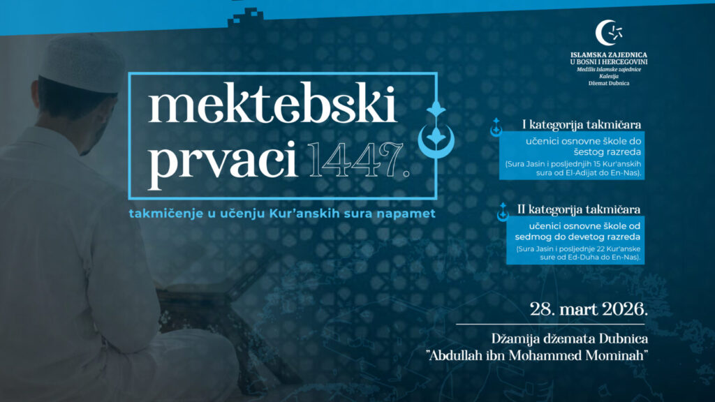 Medžlis Islamske zajednice Kalesija i džemat Dubnica najavljuje organizaciju takmičenja „Mektebski prvaci 2026“ u učenju Kur'anskih sura napamet, koje će se održati 28. marta 2026. godine. Takmičenje se organizuje s ciljem da motivira polaznike mektebske pouke, na učenje Kur'anskih sura napamet.