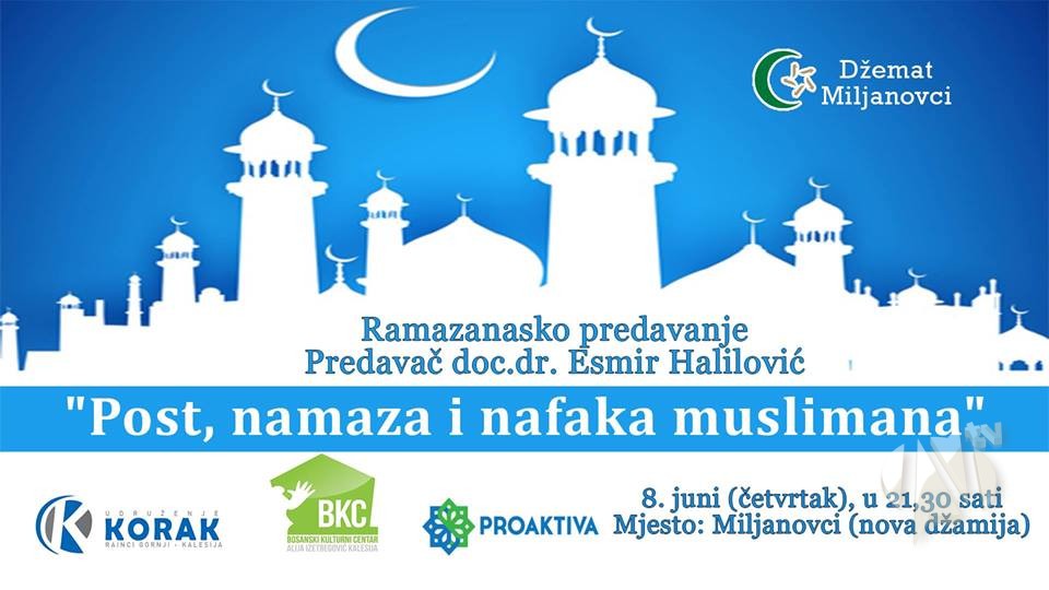 U organizaciji Udruženja “Korak”, BKC-a “Alija Izetbegović” Kalesija i “Proaktiva” u četvrtak 8. juna 2017. godine održat će se ramazansko predavanje doc. dr. Esmira Halilovića.