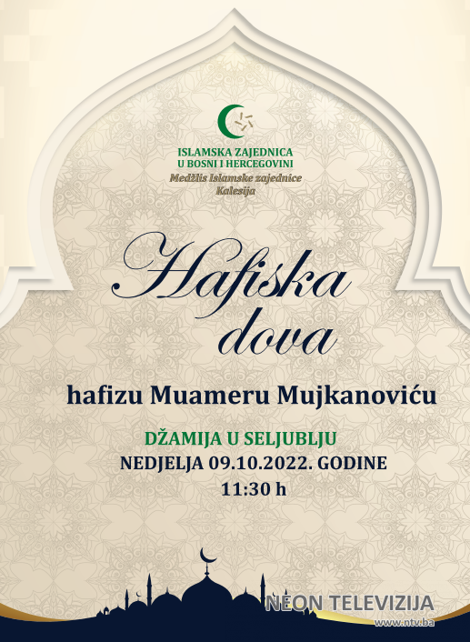 Svečana hafiska dova novom kalesijskom hafizu upriličit će se 9. oktobra 2022. godine, u džamiji u Seljublju, sa početkom u 11.30 sati. Ovim putem pozivamo sve zainteresovane da svojim prisustvom uveličaju nesvakidašnju svečanost.