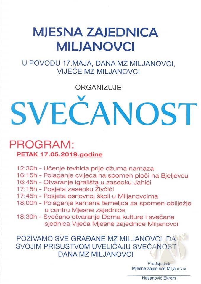 Ispred MZ Miljanovci pozivaju sve mještane MZ Miljanovci da svojim dolaskom uveličaju svečanost.