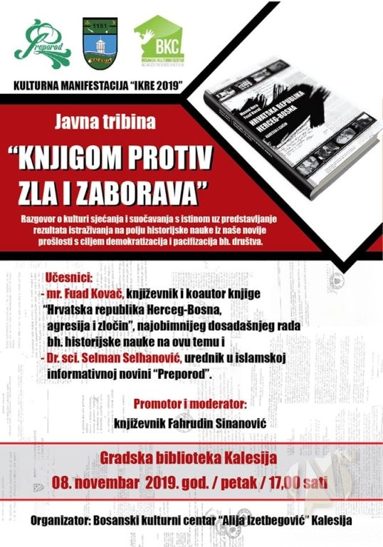 U petak, 8. novembra, sa početkom u 17,00 sati, u Gradskoj biblioteci Kalesija, održat će se javna tribina ”Knjigom protiv zla i zaborava”. Učesnici tribine su dr. Selman Selhanović i Fuad Kovač, koautor knjige ”Hrvatska republika Herceg-Bosna, agresija i zločin”, najobimnijeg dosadašnjeg rada bh. historijske nauke na ovu temu.