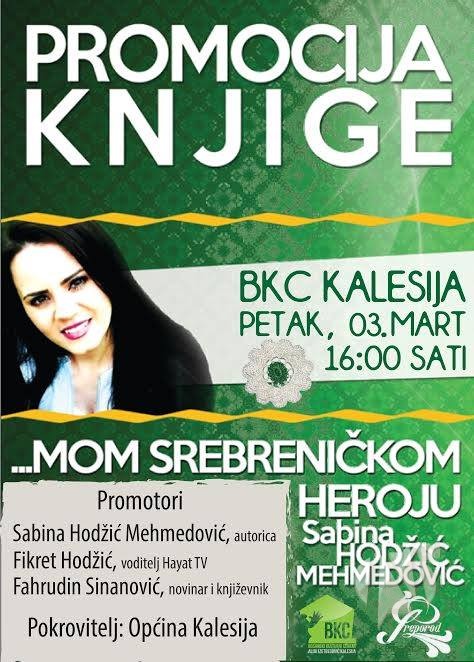 Sabina Hodžić Mehmedović održat će promociju svoje knjige “Mom srebreničkom heroju” u BKC-u “Alija Izetbegović” Kalesija u petak (03.03.2017) sa početkom u 16 sati.