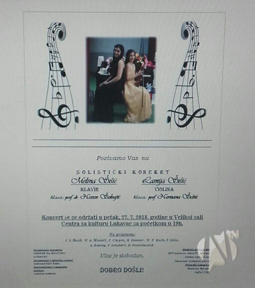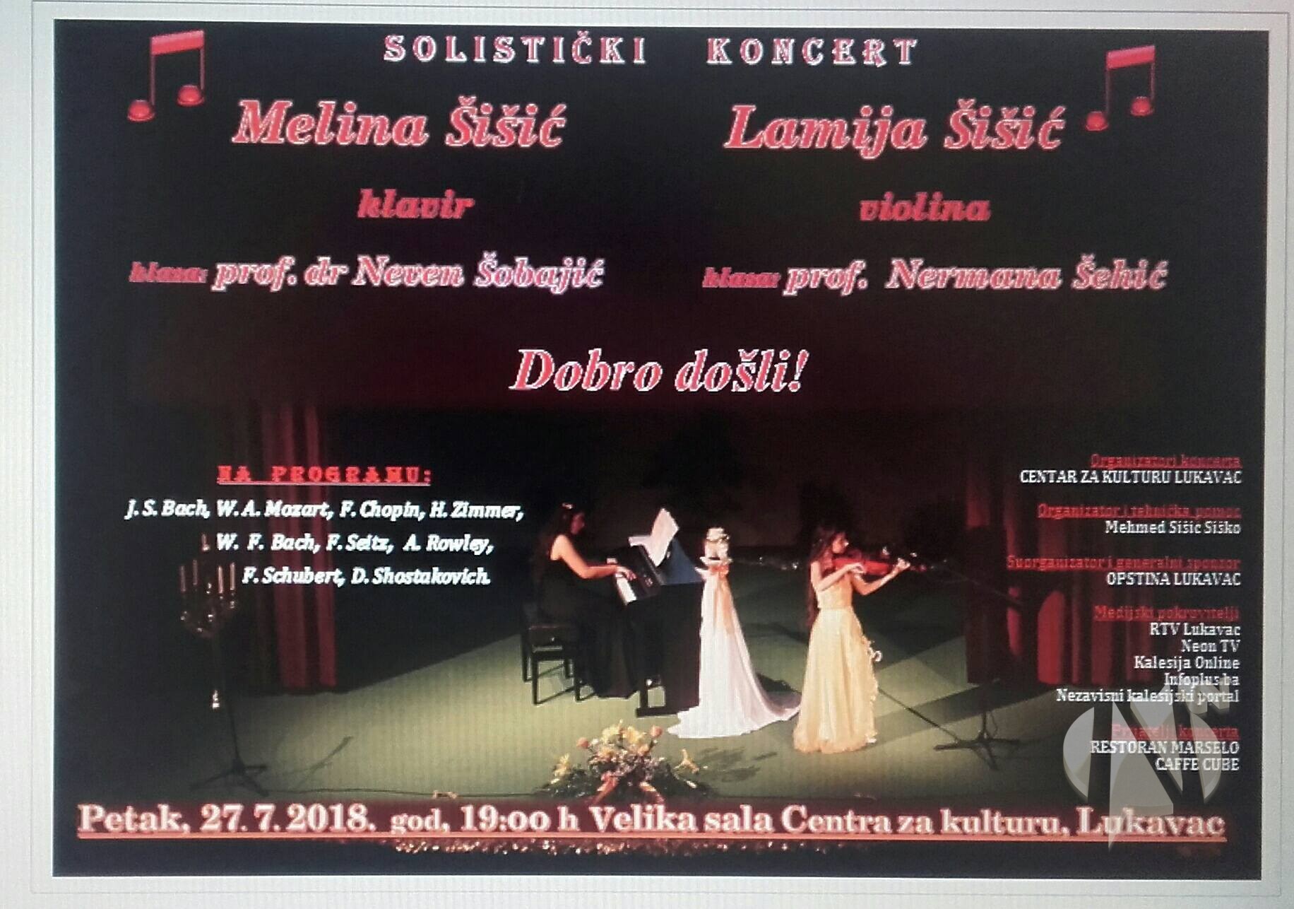 Nakon izuzetno uspješnog solističkog koncerta u BKC “Alija Izetbegović” Kalesija Lamija i Melina Šišić zvucima violine i klavira počastit će i publiku u Lukavcu. Solistički koncert sestara Šišić u Velikoj sali Centra za kluturu bit će održan u petak 27.7.2018. godine sa početkom u 19:00 sati.