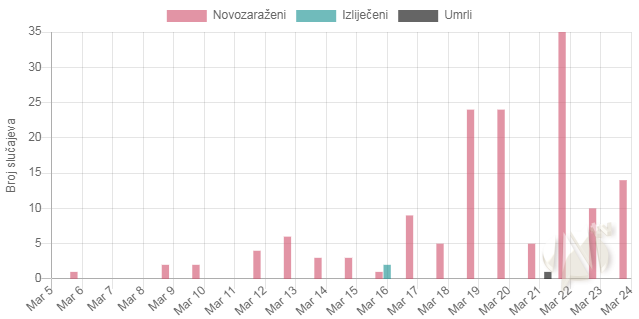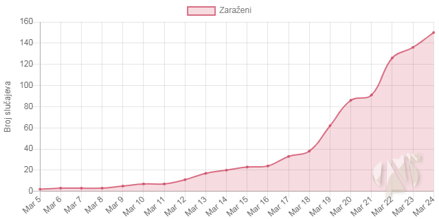 Time je ukupan broj zaraženih u Republici Srpskoj povećan na 103, a u Federaciji BiH ih je 47, što je ukupno 150 na prostoru BiH.
